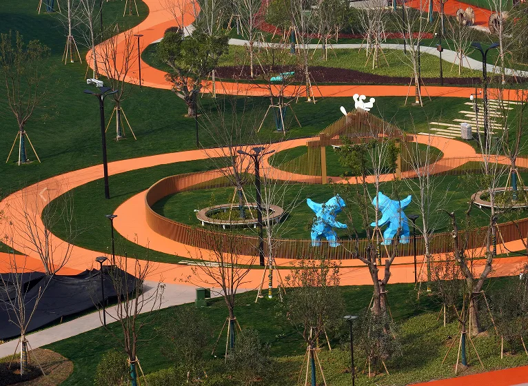 绿廊以“流动的绿川,行走的绿廊”为设计主题,整合了绿道、溪流、地形,为总部大楼集聚的瓯江新城核心区提供高品质的游憩、运动、亲子环境。2月13日,记者先行探访这条城市绿廊,感受到满目的绿意。漫步其中,一条由阿玛尼红与爱马仕橙组成的炫彩绿道贯穿全域,以流畅的弧线串联起景观节点。从华光路至汤家桥路,形成田园艺术段,分布水岸廊架、雕塑草坪、下沉广场等景观节点,其中下沉广场景观,蜿蜒步道跨越5米落差,一步一景,形成错落有致的景观层次。从汤家桥路至会展路,主打文化休闲段,极限运动场、贝壳沙滩、萌宠乐园布局其中,满足不同年龄段市民的休闲需求。