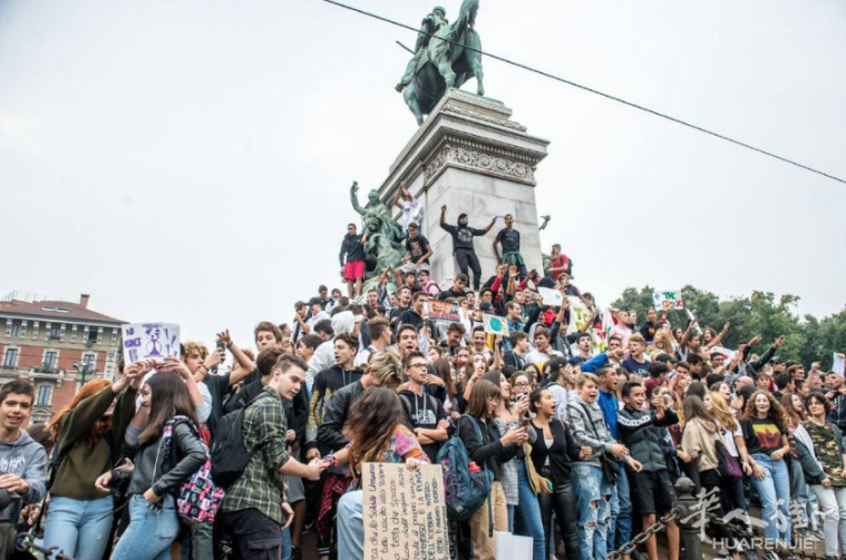 上午10点,成群结对的中小学生手举肩扛环境保护的标语集结在米兰,都灵,罗马等各地地标。罗马共和广场(Piazza della Repubblica)更是挤满了上万的学生,队伍在挥舞的海报和横幅中行进,标语多是谴责环境保护不力的现状。