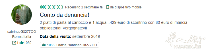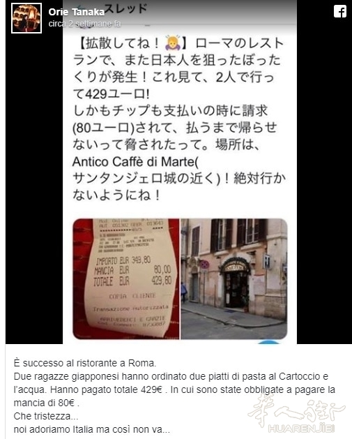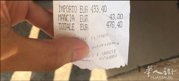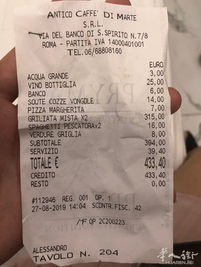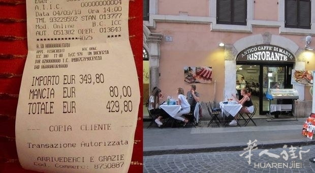 意大利《华人街》消息:罗马再现天价账单!近日两名日本游客在罗马一家餐馆用餐时,点的两道意面配纸包烤鱼竟被要价429.8欧元!两名游客在把9月4日这顿天价餐的发票上传到网络后,这家餐馆连同牵出的罗马宰客老话题再度成为网络焦点。