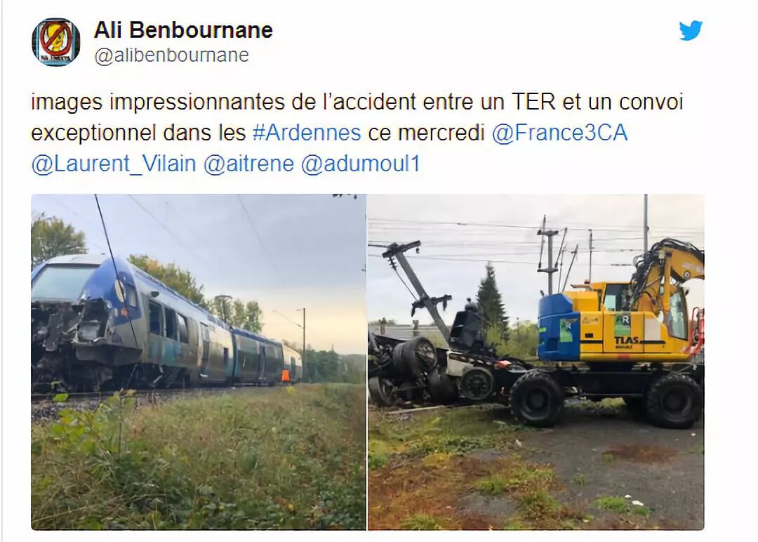 当时一辆TER列车和一辆卡车(or吊车?大概吧,叫不出名字!)在Saint-Pierre-sur-Vence(Ardennes)的交叉口相撞,车头损害严重,车身部分脱轨,并导致了11名乘客轻微受伤,其中也包括火车司机。