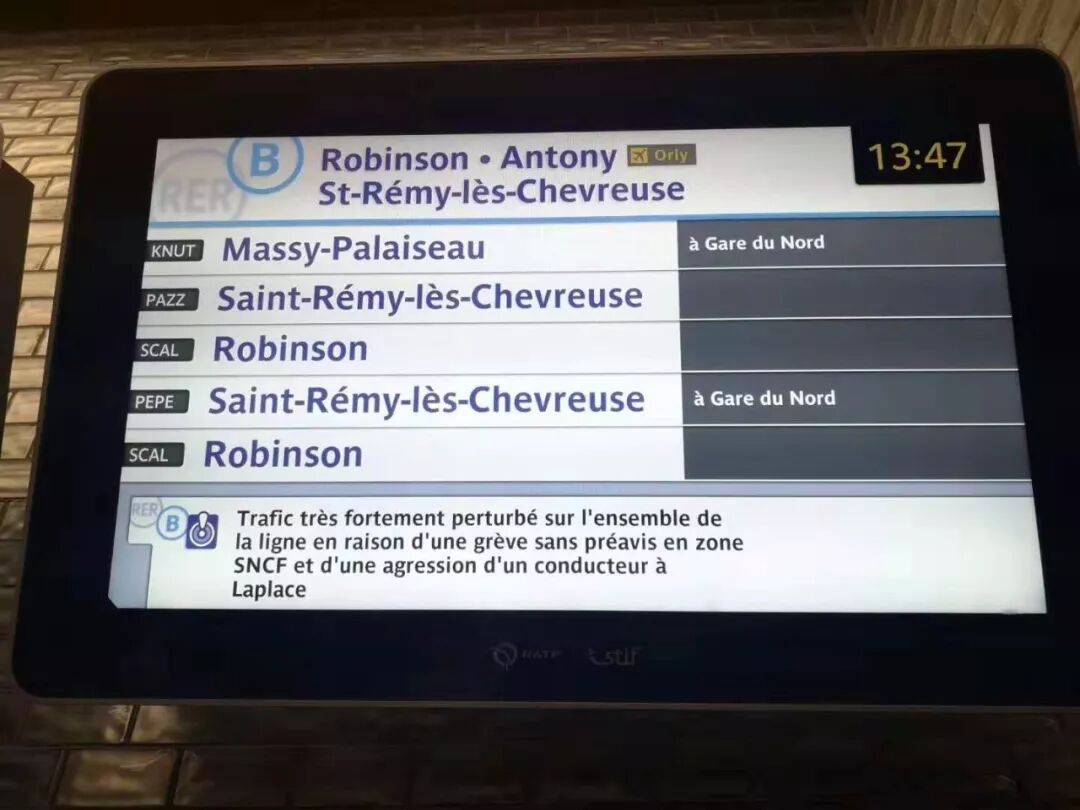 RER B线,Laplace的驾驶员罢工了,因此整个线路受到严重影响。另外,要去CDG机场的小伙伴们,必须先到Gare du Nord,换车后再到机场。而Gare du Nord到CDG机场2号航站楼之间运行的车次也少的可怜。