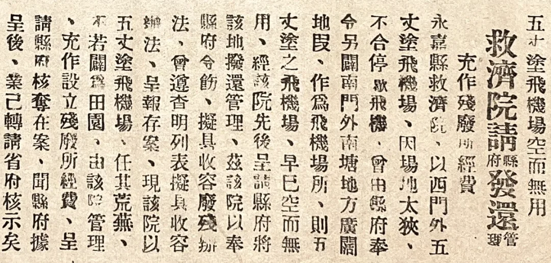《五丈涂飞机场空而无用 救济院请县府发还管理充作残废所经费》,《瓯海民报》,1935年7月28日,第三版,林楠虹同学提供。