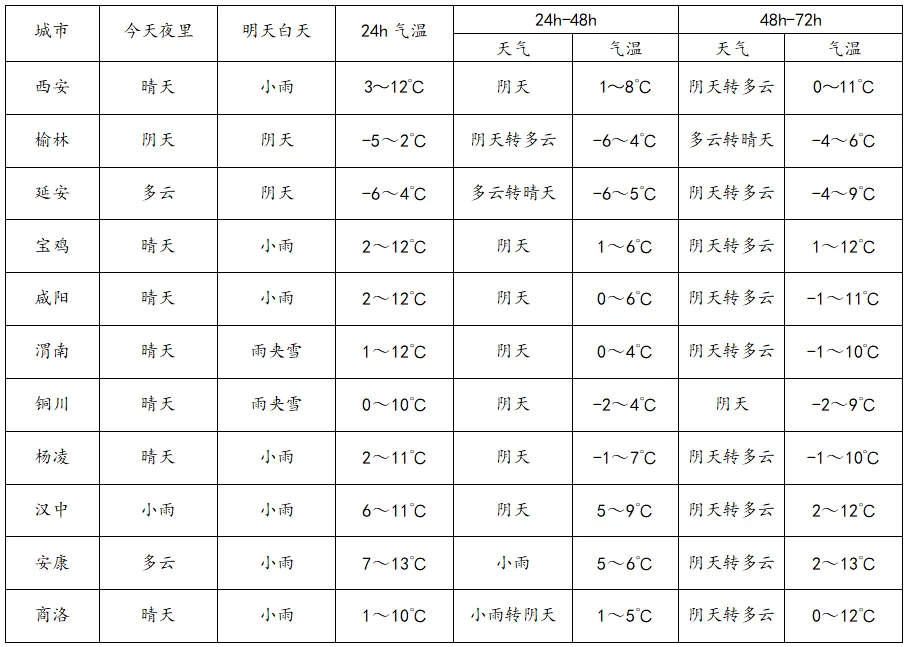 明天白天:全省多云转阴天。延安南部局地、关中北部有雨夹雪或小雪(0~2.5毫米),秦巴山区有小到中雪(3~4毫米),巴山局地有冻雨。关中南部、陕南有小雨或雨夹雪(0~5毫米),陕南南部局地有中雨(6~15毫米)。陕北大部、关中北部和秦岭山区有4级(5.5~7.9米/秒)左右偏北风,阵风可达6级(10.8~13.8米/秒)以上。日平均气温全省大部下降4~6℃,关中、秦岭山区和陕南东部下降6~8℃,局地可达10℃以上。