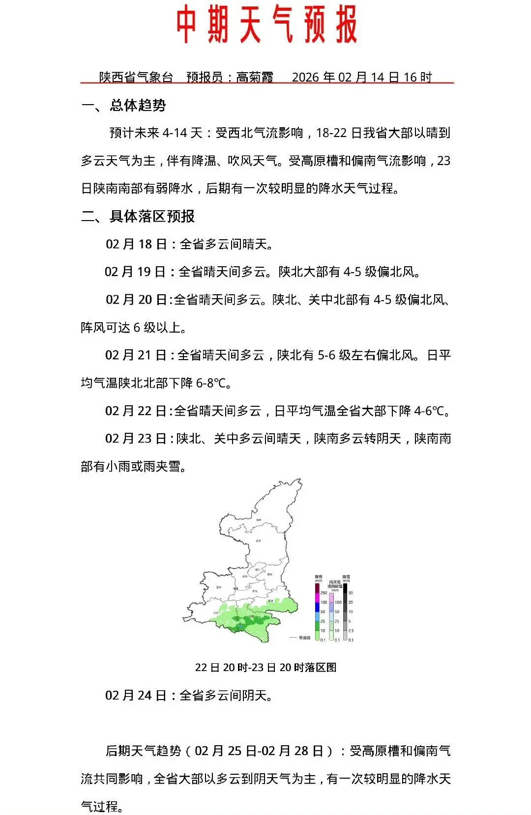 02月15日20时-02月16日20时:全省阴天,秦巴山区东段、商洛有小雪(0~1毫米),汉中南部局地、安康南部有小雨或雨夹雪(0~8毫米)。陕南大部日平均气温下降4℃左右。