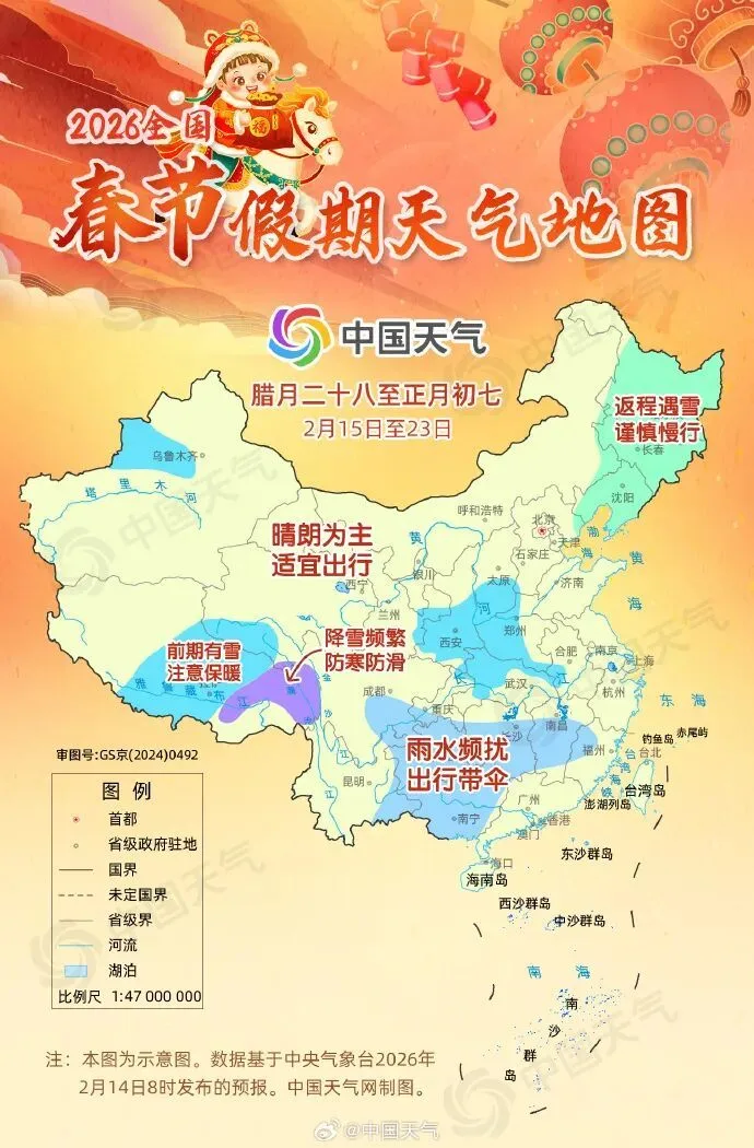 春节假期(腊月二十八至正月初七),我国无大范围雨雪冰冻等灾害天气,总体适宜出行;全国大部地区气温较常年同期偏高1至3℃,但气温起伏较大;节日中期天气条件较好,节日前期和后期将有降水降温过程。