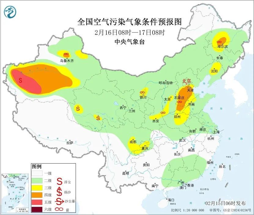 15日至16日白天,区域大部地区大气扩散条件一般,山西中南部、陕西关中等地有间歇性轻度霾。16日夜间起,区域北部大气扩散条件逐渐转差,有轻至中度霾。