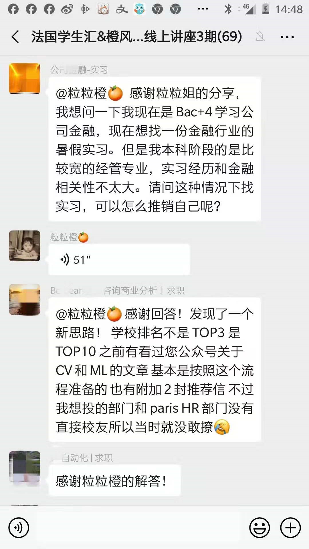 群内小伙伴们完全没有浪费时间,不少人把自己的CV和面试中遇到的问题发到群中,直到最后一个小时还有朋友在提问,粒粒橙也分别给大家不同的意见,大家都收获满满。