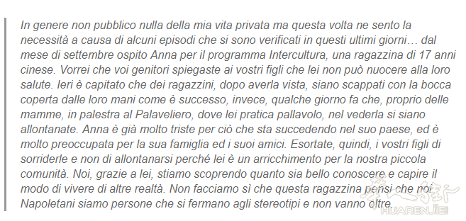 通常我从不发任何关于我私人生活的事情但是这次因为这几天发生的某些事情我感到有必要。从9月份开始因为多文化计划我接待了安娜,一名17岁的华人女孩。我想你们家长们跟你们的孩子们解释她不会危害他们的健康。昨天发生了一些青少年孩子们,看到她后,就用手捂着嘴跑开了,还有几天前,一些妈妈们在安娜她打排球的Palaveliero运动场里,看到她后就离开。安娜已经因为她国家发生的事情很悲伤了,很担心她的家人和朋友。因此,请敦促您的孩子对她微笑而不要远离她,因为她是我们小社区的财富。 多亏了她,我们才能发现和理解我们生活的方式真是太好了。 不要让这个小女孩认为我们那不勒斯人是那种在刻板且停滞不前的人