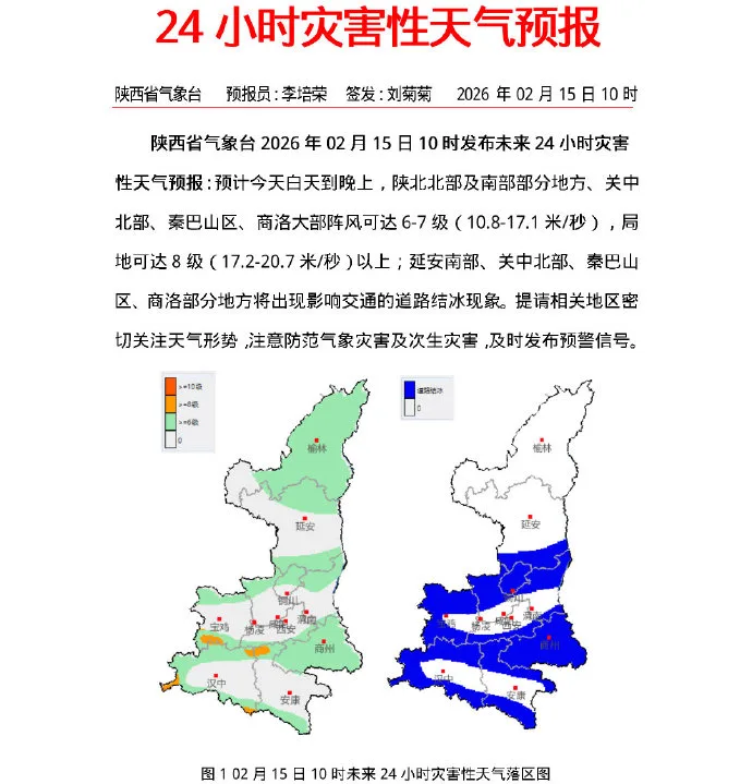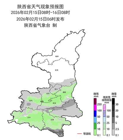 2月15日:全省阴天间多云。关中南部、陕南平原地区有小雨或雨夹雪(0~6毫米);延安南部、关中北部、秦巴山区有小雪或雨夹雪(0~2.5毫米),秦巴山区局地有中到大雪(2.5~8毫米)(图1),巴山局地有冻雨。陕北大部、关中北部和秦岭山区有4级(5.5~7.9米/秒)左右偏北风,阵风可达6级(10.8~13.8米/秒)以上。日平均气温全省大部下降4~6℃,陕北北部、关中西北部局地、秦岭山区和陕南东部下降6~8℃,局地10℃以上。夜间至清晨延安南部、关中、陕南有轻雾,秦巴山区局地有大雾。
