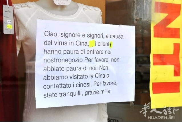 意大利南部Reggio Calabria市via Ipponio一家华人商店老板于星期六2月8日上午贴了一张牌子,上面写着:“女士们,先生们大家好,因为中国的新冠肺炎病毒,客人都害怕进入我们的店里了,拜托,你们不需要害怕,我们没去过中国或跟中国人接触过,请你们放心,非常感谢”。
