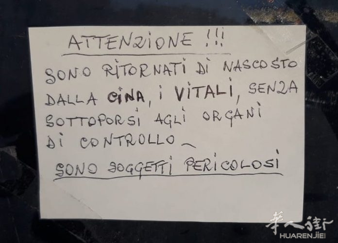 意大利《华人街》2020年2月11日费尔莫消息:费尔莫省Monterubbiano,对新冠病毒的神经质般的恐慌,惊现一些传单针对当地一户人家:“他们偷偷地从中国回来,他们很危险”。