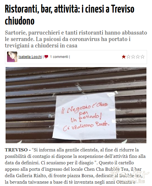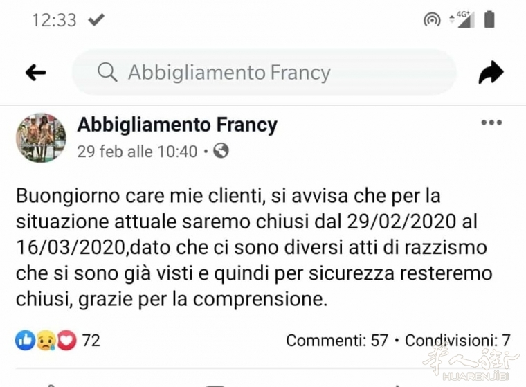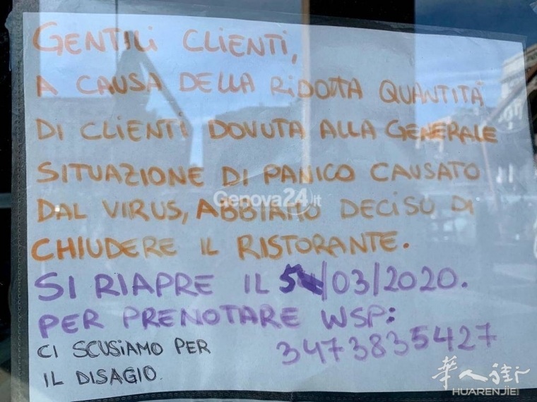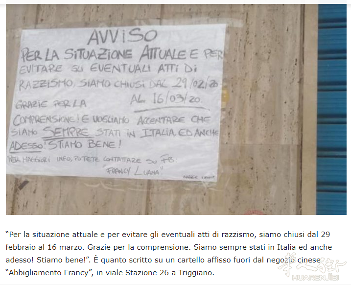 您的位置 > 首页 > 意大利 疫情严重?意大利各地从南到北众多华人店铺关门引起媒体关注 ... ... 来源: 网络新闻 | 2020-03-07 | 👁:81627 意大利《华人街》2020年3月综合消息:根据综合近几日的众多意大利媒体报道,意大利各地从南部到北部都有华人各行业的店铺被迫关门停业。 许多店门贴上通知写着关门度假的日期,但是没写原因,其中具代表性的有巴里省Triggiano市镇一家华人服装店写的:“由于目前的局势,为避免种族主义事件的发生,我们从2月29日至3月16日关门停业,感谢您的理解, 我们一直都在意大利乃至现在, 我们很好!” 这是在中国人的服装店“ Francy”外面张贴的标语上写的。 “我们通知尊敬的客人们,为了减少传染的可能性,我们暂停了营业活动,直到确定的日期为止, 不便之处,敬请原谅“这是特雷维索piazza Borsa前面的一家华人酒吧门口贴的,另外当地一家日本餐厅贴的度假通知也从最初的至3月3日为止延后到3月10日。 而在佩斯卡拉省Montesilvano市镇的几乎全部华人经营的餐厅,商店等都拦下铁帘门写着关门度假引发当地媒体的关注,甚至派出摄制组采访,许多华人不愿透露关门的具体原因是什么,记者通过联系到“ Montesilvano nel cuore”协会的Gianfranco Costantini采访他说道:近来电视台提供的媒体宣传无疑引导了人们的行为,有一定生意额下降了,首先受到影响的是中国人的生意,但这不是对华人社区的种族主义态度,如今,他们已更加融入城市的社会结构了。相反,一家华人裁缝店且于上周末遭受恶意破坏后却又开始营业。 意大利北部的热那亚和瓦雷泽地区也有许多华人行业关门,甚至一条街都关门贴上通知停业。 一下子出现这么多华人各行业店铺的关门停业,显然已经引起了媒体的关注,至于是不是引起当局的注意显然也是肯定的,早在意大利疫情爆发之前就曾有地区发布命令让警方加强对华人社会群体所在区域的巡逻监管以避免因病毒引发的针对华人的歧视性现象的发生。(alexzou编译,消息参考:Milano Post/youtvrs.it/bari.ilquotidianoitaliano/ilpescara.it/oggitreviso等网站) 标签: 暂无标签 上一篇 查获在普拉托和罗马之间贩卖毒品,22名华人被立案调查 ❤️ 赞一个 (0) 🔗 分享 用户评论 (0) 暂无评论,快来抢沙发吧!首评可提升互动曝光。 请 登录 后参与互动 ↑ 顶部 安装 App