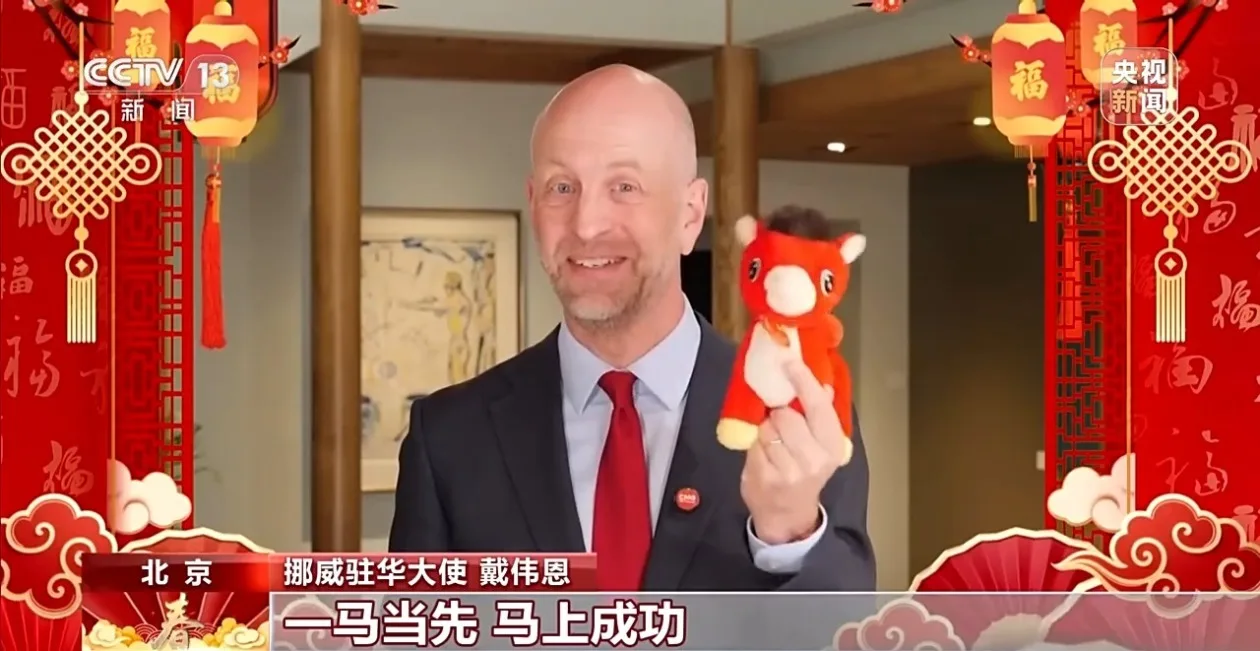 作为最早同新中国建交的国家之一,挪威与中国在绿色、海洋、文化等领域合作密切。如今,中国已成为挪威海产全球第三大出口市场,也是出口额增长最大的国家。就在去年的进博会上,鲜活的挪威面包蟹与棕奶酪正式叩开中国市场大门,越来越多的挪威味道摆上中国百姓餐桌。挪威驻华大使戴伟恩,今年第二次在中国过春节。在他看来,与家人和朋友团聚、享用美食,是节日中最温暖的部分。戴伟恩表示,刚刚过去的蛇年,中挪两国关系硕果累累、稳步向前,期待在马年与中国开展更密切合作,并送上最应景的祝福“马上成功”。