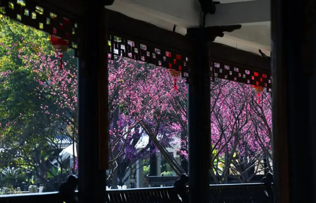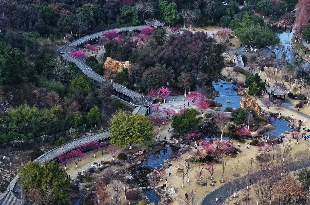 杨府山公园内的梅园临水而植,红梅、绿萼梅、宫粉梅等200余株各展风姿。梅影与盘溪廊、七彩莲池的冬日景致相映,宛若一幅清新水墨画。