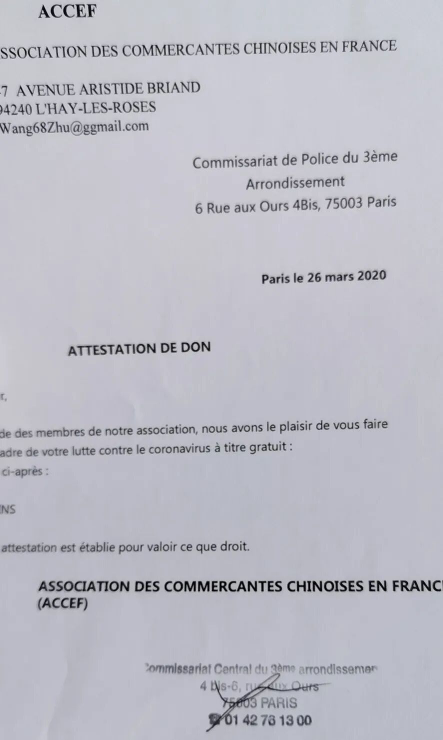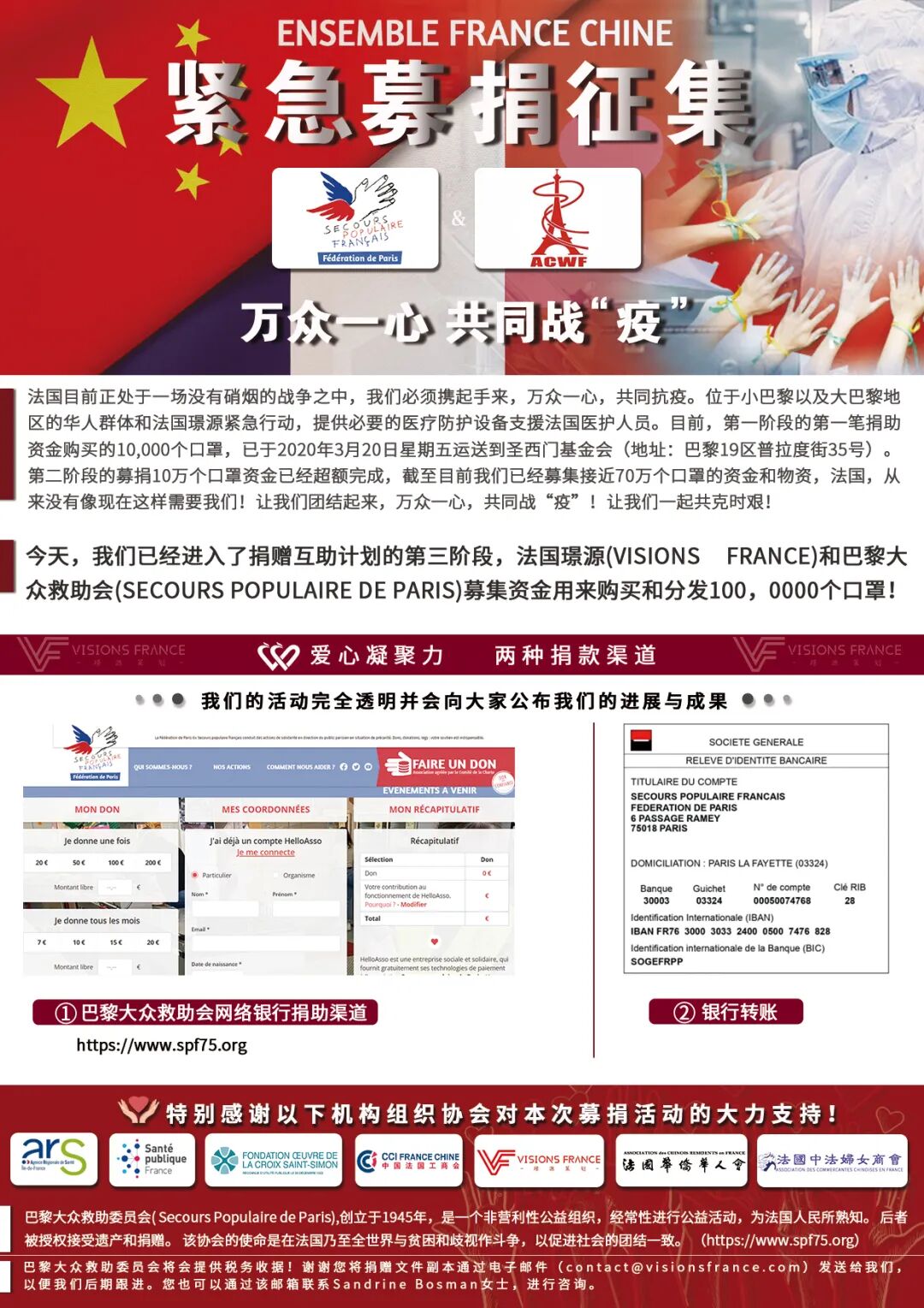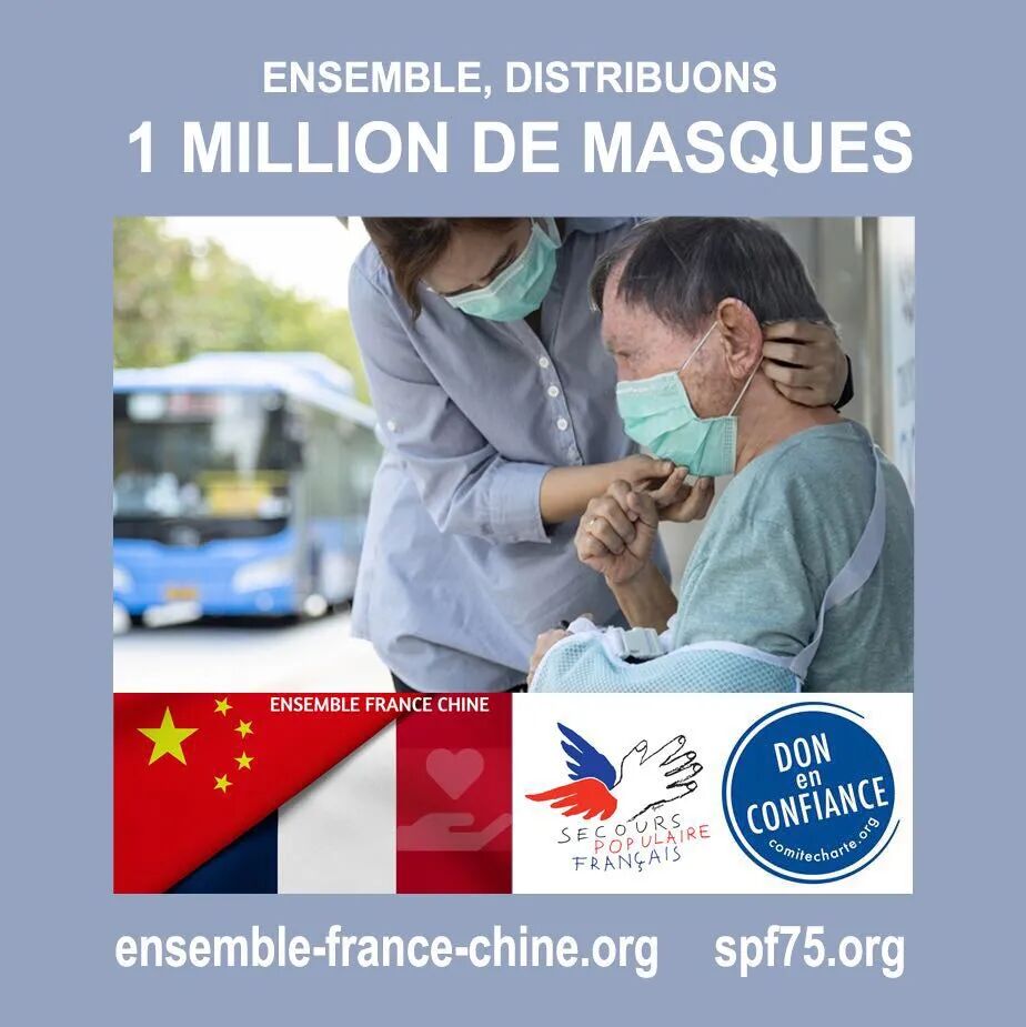 Association Ensemble France Chine协会旨在便于与巴黎大众救助会合作,分发通过“万众一心,共同战‘疫'”行动募捐并购买的100万个医用口罩。自3月20号起,其志愿者已经向全法多地区医院运送了10万多个口罩和一千多升的含酒精洗手液。协会也将会继续和巴黎大众救助会合作,共同募捐,一起战“疫”。