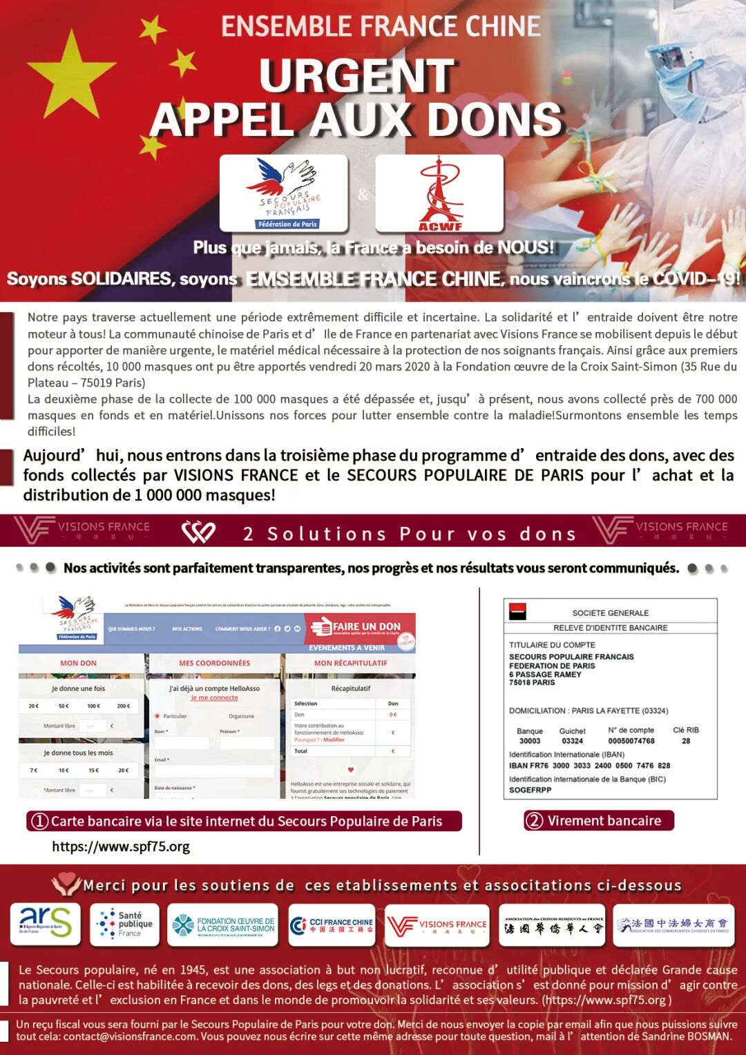巴黎大众救助会将会提供税务收据。 感谢您将捐赠文件副本通过电子邮件(contact@visionsfrance.com)发送给我们,以便我们后期跟进。