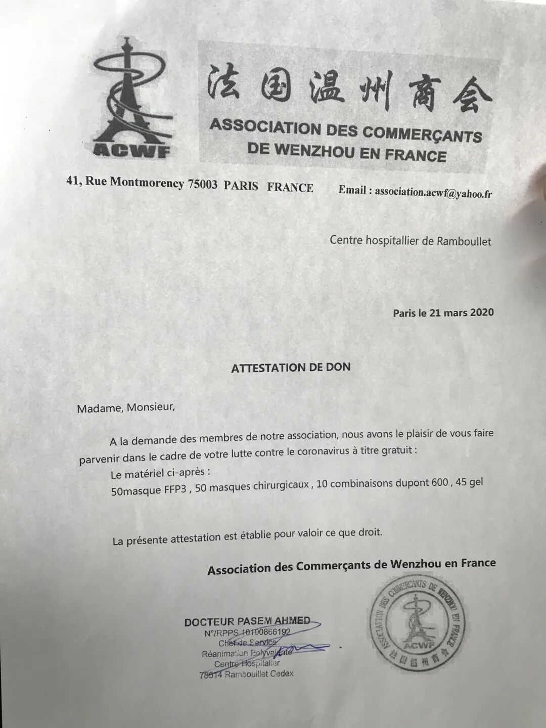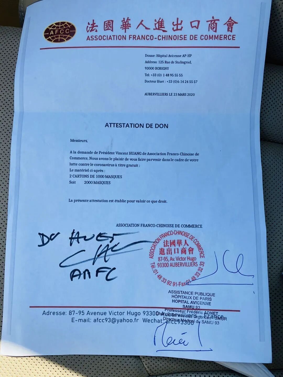 法国华人进出口商会对巴黎Avicenne医院捐助