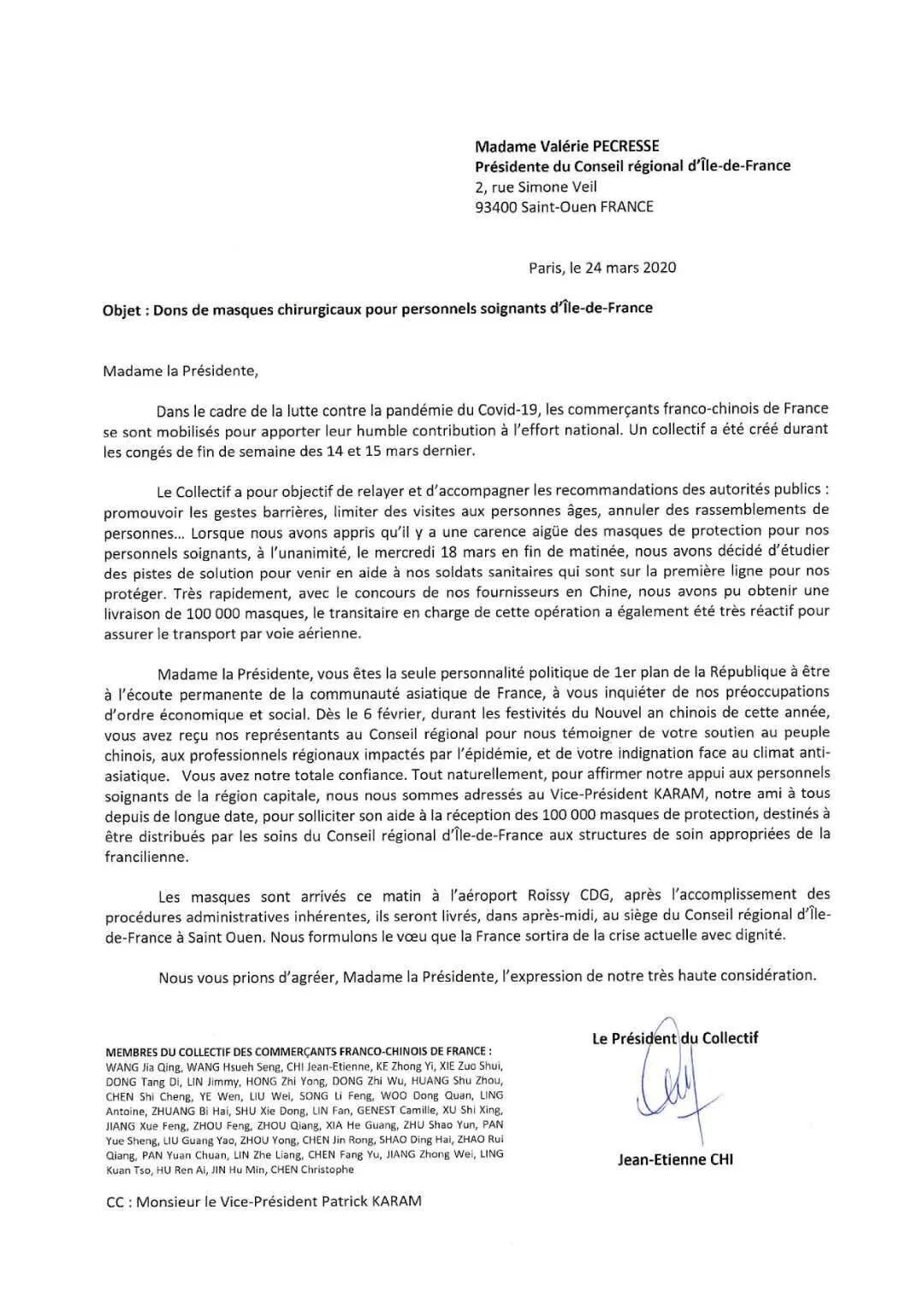 当天下午,当这批物资送达巴黎大区议会的时候,主席瓦莱丽·佩克莱斯(Valérie Pécresse)也来到现场,还尝试说中文“谢谢”向捐助者表示感谢。