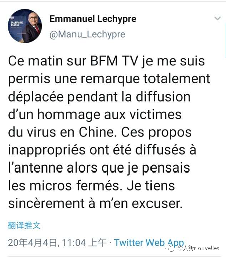 "今天早上,BFM电视台上播放向中国的病毒受害者致哀片段时,我发表了完全不恰当的言论。