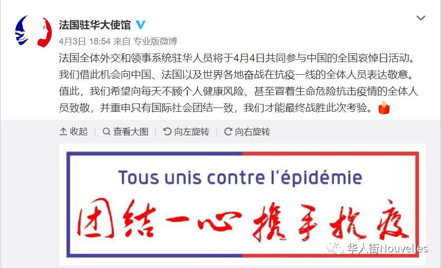 和世界各国驻华使馆一样,法国驻华大使馆也在微博上着重表示,向奋战在抗疫第一线的全体人员致敬,并重申只有团结一致,才能最终战胜此次考验 !