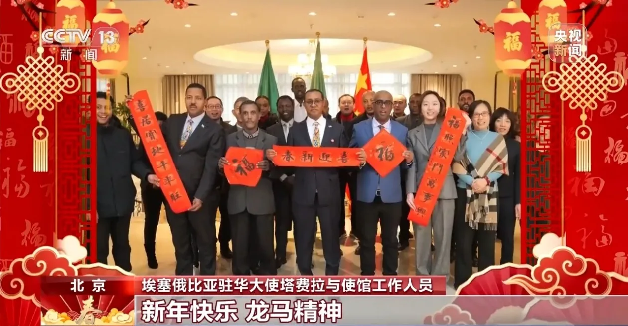 埃塞俄比亚驻华大使塔费拉与使馆工作人员:我祝愿全体中国人民,欢度繁荣、健康、幸福的新年。新年快乐,龙马精神!
