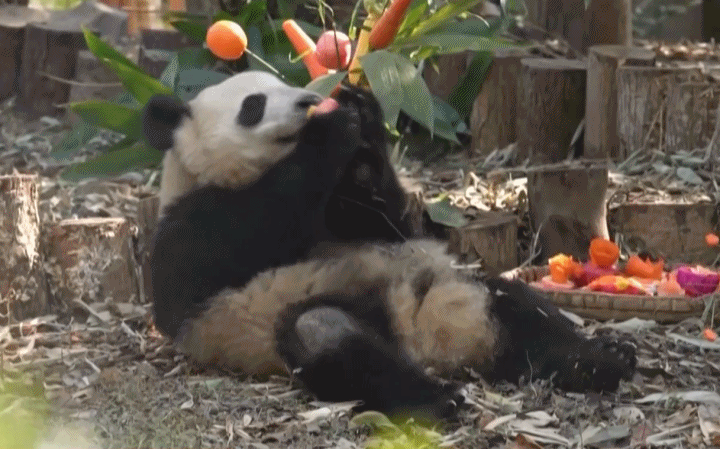 这份摆在大熊猫母子面前的“新年大餐”食材相当丰富,苹果、胡萝卜、火龙果等搭配在一起。在这份美味背后可藏着大学问,它实际上是一套科学设计的“丰容套餐”!特意做成了好看又好“玩”的样子,目的就是让小家伙们在享受美食的同时,也能多动脑筋、多探索。