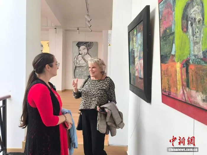 2月12日,爱娃与意大利朋友参观正在海口骑楼老街展出的“文艺复兴·佛罗伦萨”艺术展。 中新网记者 张茜翼 摄