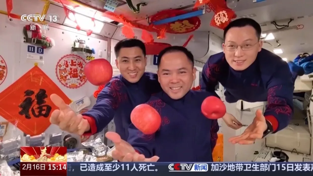 航天员 张陆:大家过年好!这里是中国空间站,我们是神舟二十一号乘组,在这个举国欢庆、全家团圆的日子,我们在空间站过大年。