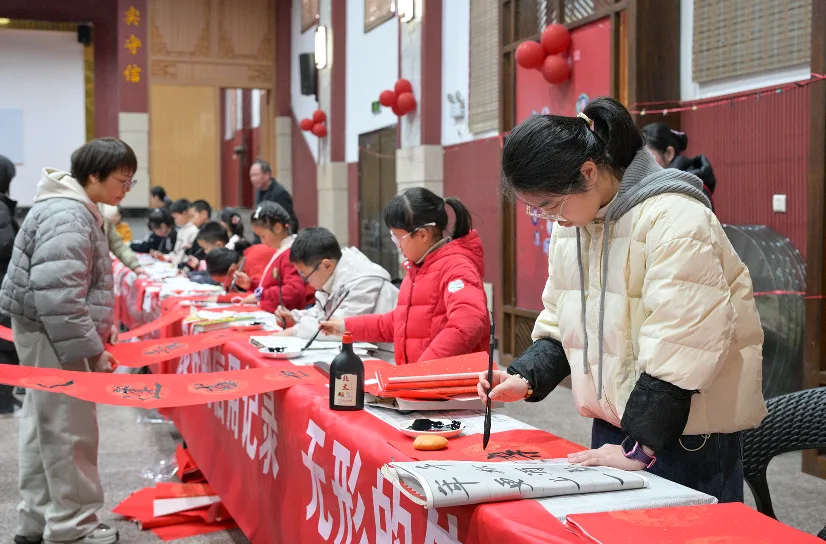 现场,逛市集、品年味、赏民俗的居民络绎不绝,处处洋溢着喜庆祥和的新春氛围。大家沉浸式体验漆扇绘制、福字拓印等非遗特色活动,感受传统文化的独特魅力。小小书法志愿者则挥毫泼墨,书写春联,免费发放给往来群众。一幅幅寓意吉祥的作品,传递着新春的美好祝福。