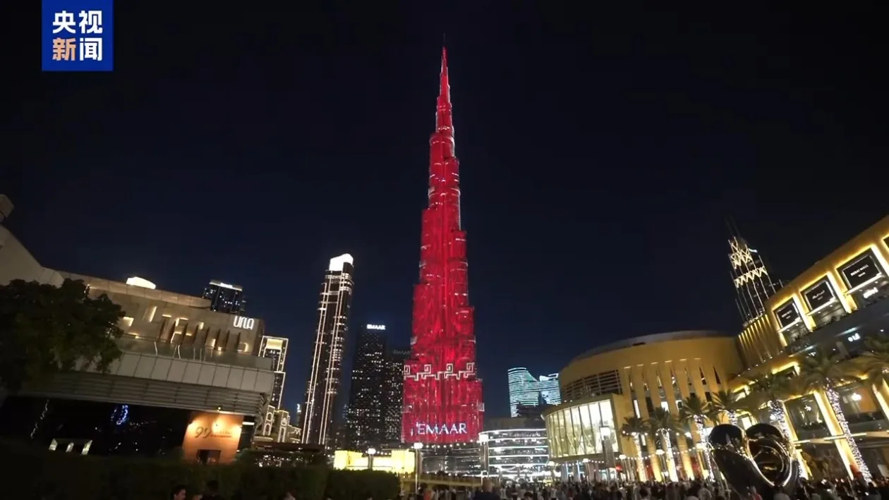 春节前夕,2026年中央广播电视总台新春灯光秀在位于阿联酋迪拜的世界最高楼——哈利法塔璀璨绽放。这已是总台连续第七年在新春佳节到来之际点亮哈利法塔。