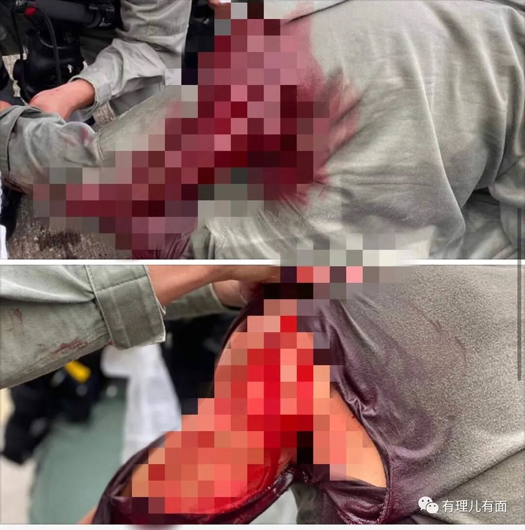 16时左右,有警员在拘捕嫌犯过程中遭到对方暴力反抗,同时周围有多名暴徒不断用利器、雨伞、砖头等物攻击警员,将嫌犯“抢走”,该警员最终左肩受伤,流血不止。