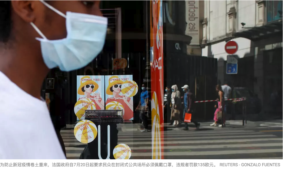 自5月11日解封以来,法国民众只有在乘坐公共交通时被要求必须佩戴口罩。一些商场、商店通常自行要求顾客佩戴口罩,或者只是建议佩戴。自20日起,各地商场、商店、政府办公部门、银行以及封闭的市场,公众都必须佩戴口罩,违者将面对135欧元罚款。