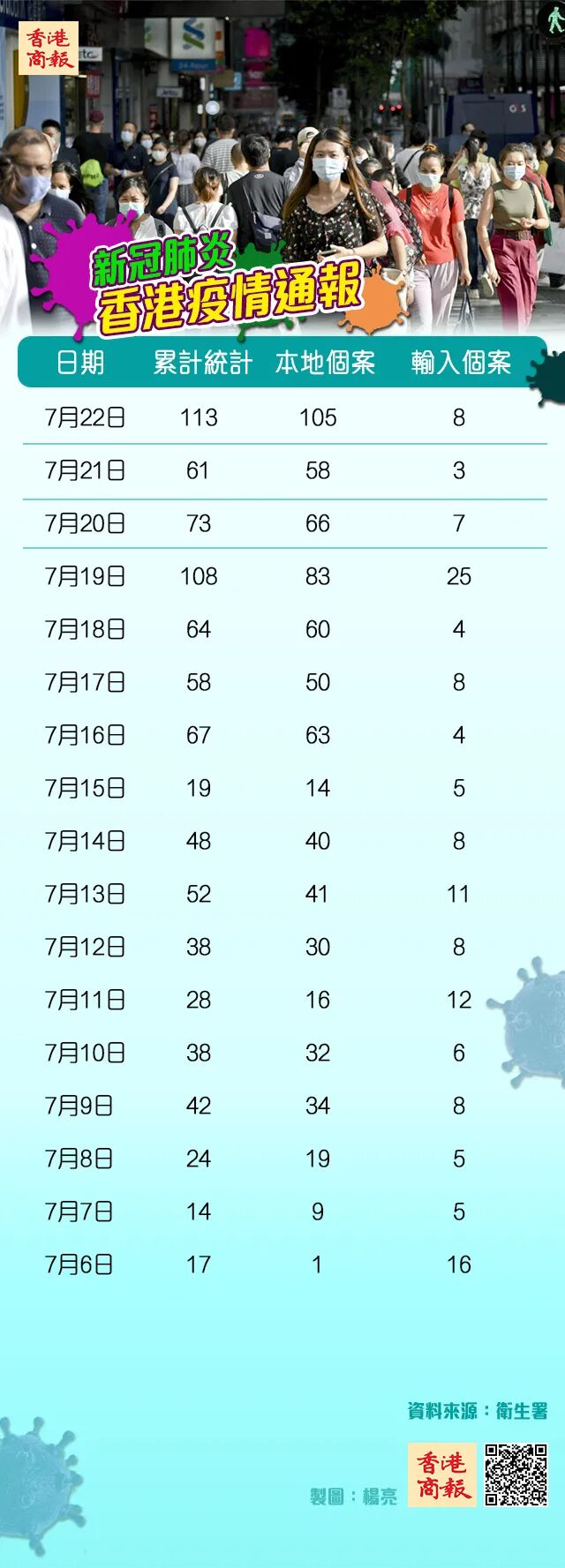 截至昨日零時,本港新增113宗確診病例,其中本地感染105例同創新高,創有疫情以來單日新高。食物及衛生局局長陳肇始表示,未來一兩星期是疫情發展的關鍵,如果確診個案持續上升,政府不排除採取更嚴厲防控措施。