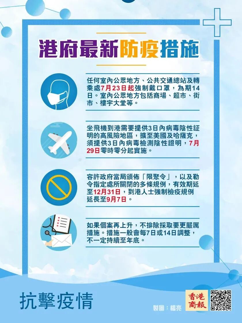 除了進一步擴大佩戴口罩範圍之外,政府亦會加強從高風險地區抵港人士的管制。陳肇始表示,抵港人士如當日登上從香港以外到達香港的飛機,或之前14日內曾身處任何指明地區,包括孟加拉國、印度、印度尼西亞、尼泊爾、哈薩克斯坦、巴基斯坦、菲律賓、南非、美國共9個地區相關到港人士必須提供72小時內的陰性核酸檢驗結果,以及在香港預訂酒店的確認書,租住時間不少於14天。有關規定將在7月29日零時零分生效。限聚令將延至12月31日