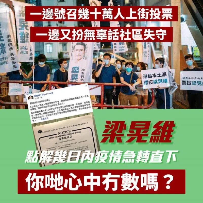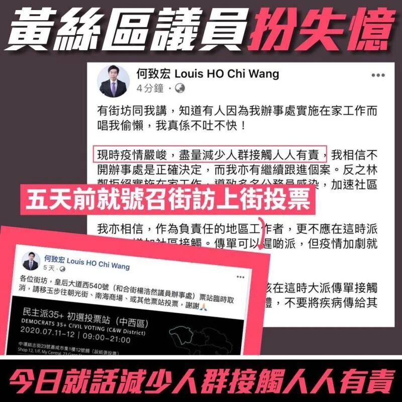 還有反對派議員前腳號召街坊上街投票,後腳又稱疫情嚴峻應盡量減少人群接觸......