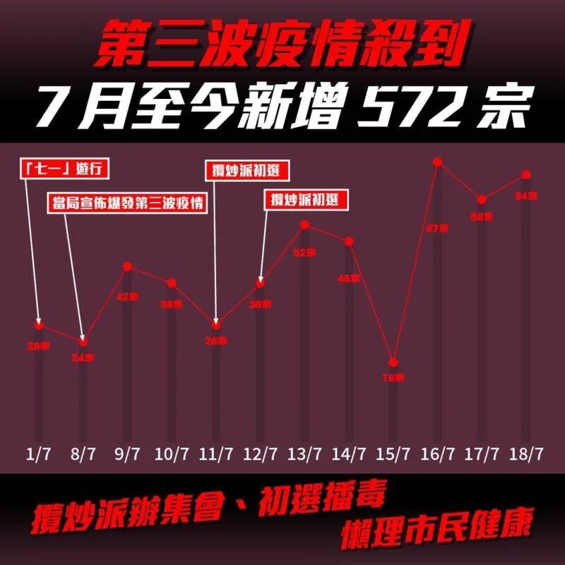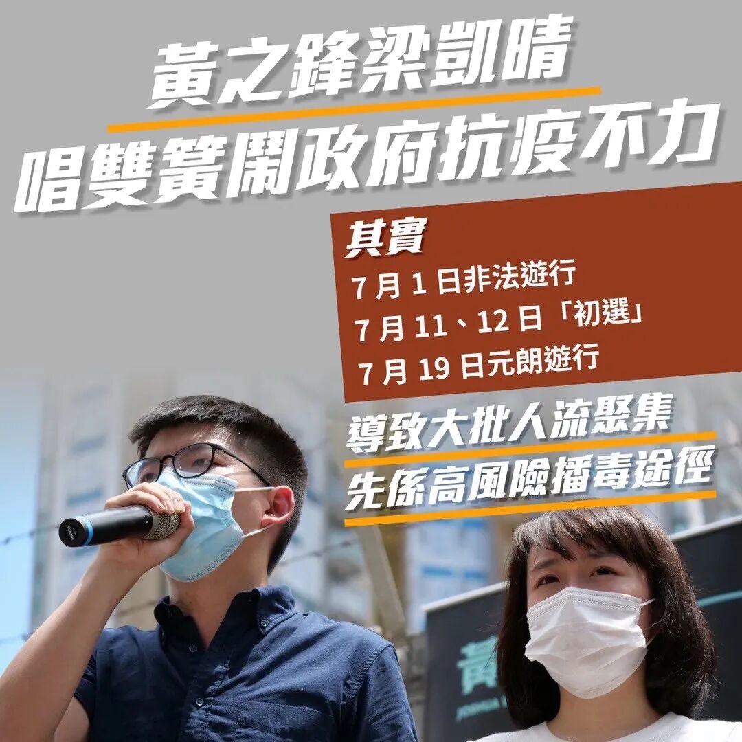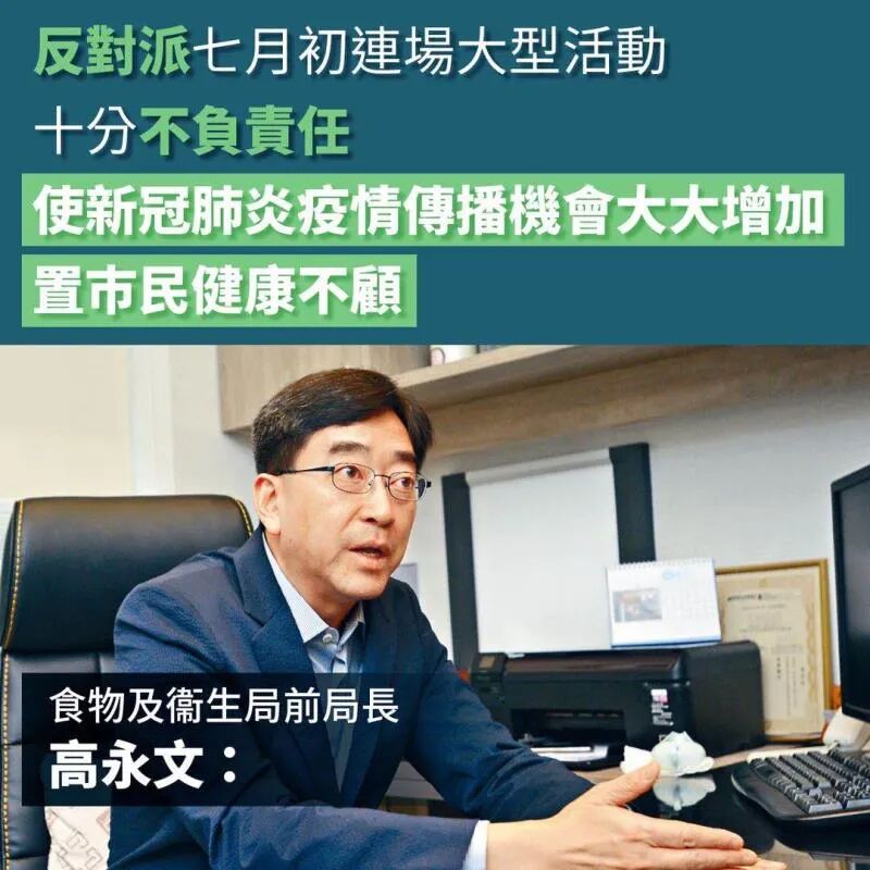 香港前食物及衛生局局長高永文也直言,反對派置市民健康不顧,在7月初辦了連場大型活動,十分不負責任,使新冠肺炎疫情傳播機會大增。