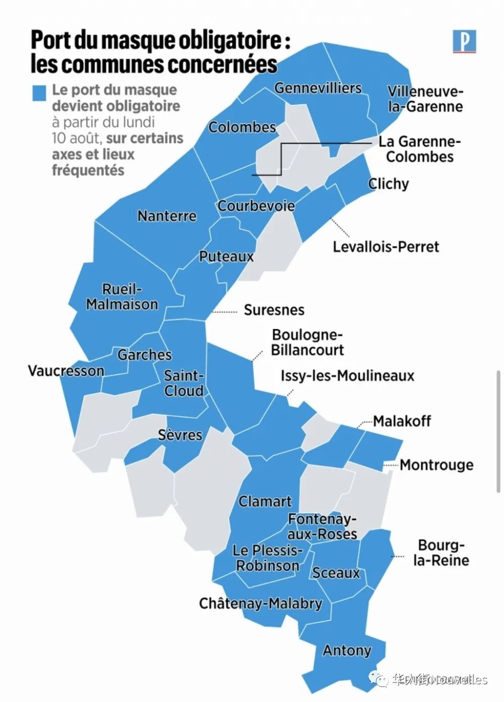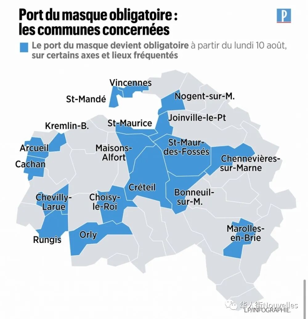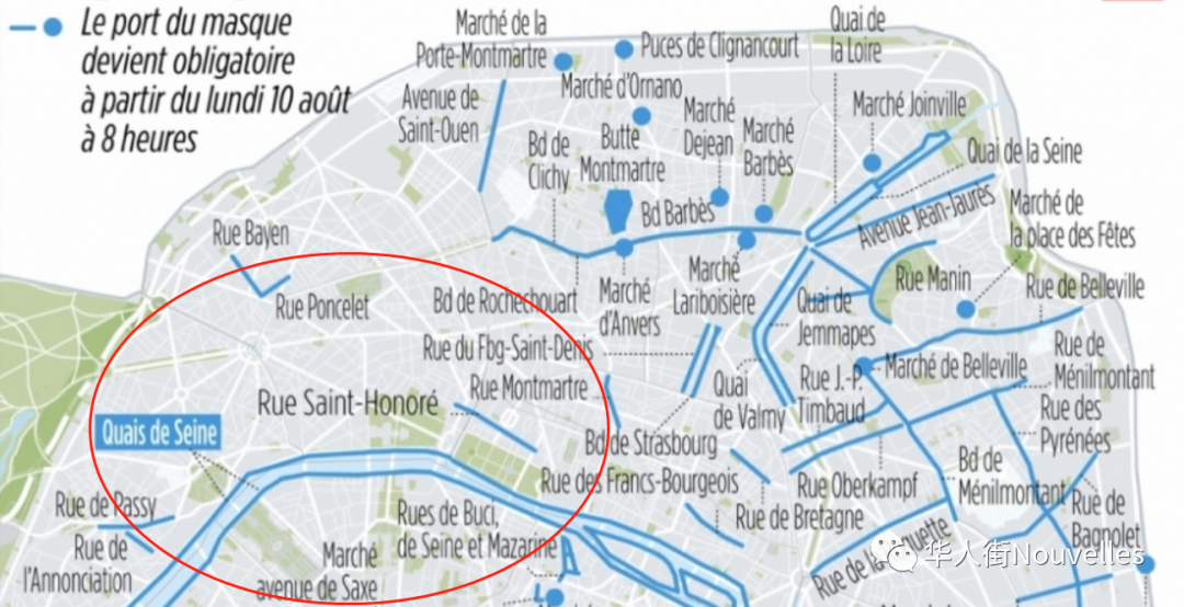 最后,附上巴黎市区和92省、93省以及94省出门必须佩戴口罩的区域示意图,供读者们参考。