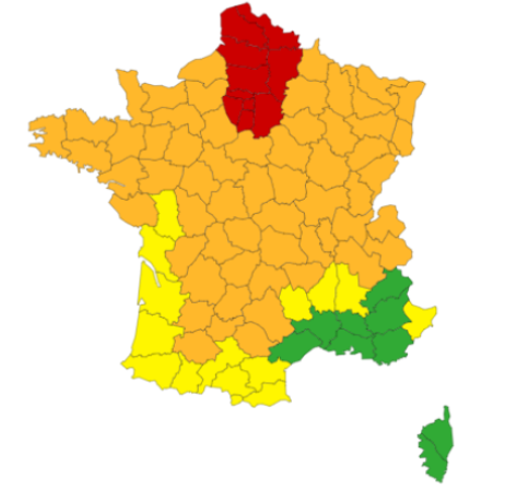 好消息,终于快转凉了。法国气象局今天向法国北部的13个地区发布了雷暴和热浪红色预警。虽然有雷雨天气,但不一定会凉快多少。 今天傍晚的时候在法国西南可能会下阵雨,东南部将保持干燥天气。