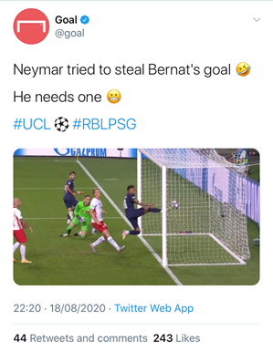 网友吐槽,“内马尔想要偷贝尔纳进的球,因为他需要。“