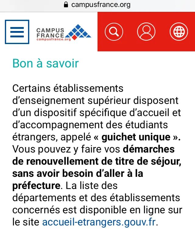 另外,根据Campus France提供的信息,法国一些省份的高校或学生机构建立了独立窗口(Guichet Unique),专门为外国学生提供学生居留办理服务。学生只需直接前往这些服务中心,就可以完成办理,不用自己去préfecture哦!