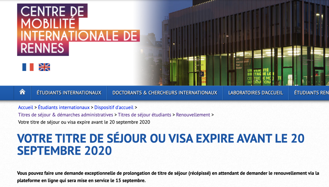 • 学生居留9月20日前到期的学生,可申请一次额外的récépissé延期,并当场领取,以便能够等到9月15日在线上平台办理学生居留。具体流程见CMI官网(雷恩帮助外国学生办理学生居留的机构)最新消息:https://cmi.univ-rennes.fr/fr/etudiants/demarches/ts/avant-20sep