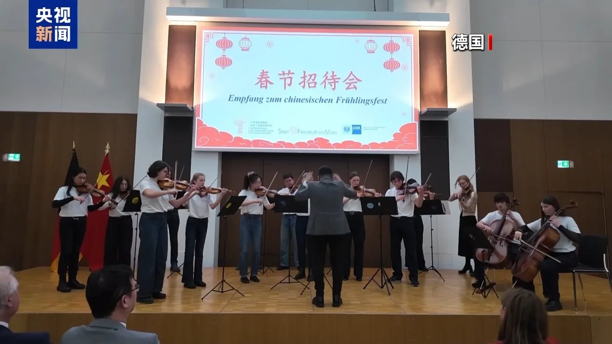 在中国驻法兰克福总领馆与法兰克福市政府联合举办的春节招待会上,来自达姆施塔特弦乐器音乐学院青年弦乐团的师生共同演绎中德经典曲目,展现两国文化交流的和谐之美。