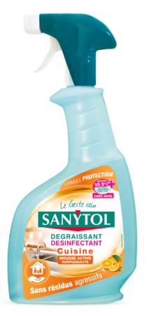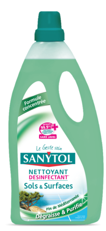 以下三款从左至右分别为:专门针对“Sols et Surfaces(地面和大块区域【门、瓷砖】)”、“Cuisine(厨房)、“Salle de Bain(浴室)”的清洁消毒用品: