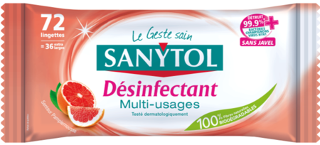 - 在选择清洁物品表面的湿纸巾时,要找到印有“Multi-usages(多种用途)”字样的湿纸巾。这类湿纸巾可用于清洁洗手台、卫生间、厨房用品、电脑电视屏幕、儿童玩具等。如下图:图源:www.sanytol.fr