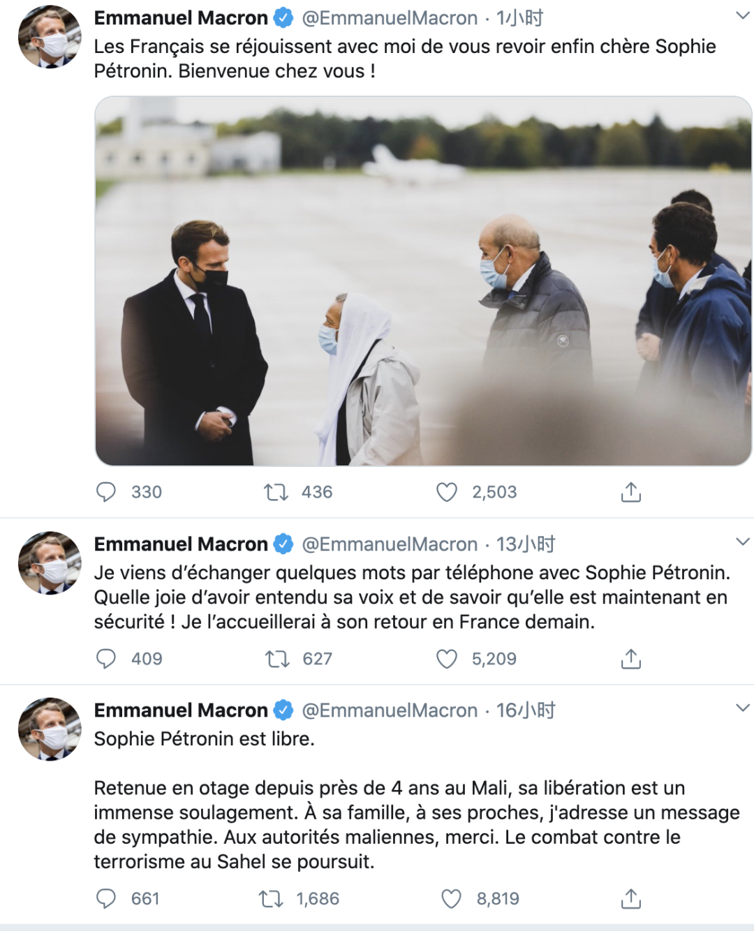 马克龙甚至发了三条推特,表示对贝特罗南夫人获释的激动之情,也感谢马里政府在此事上所作出的努力: