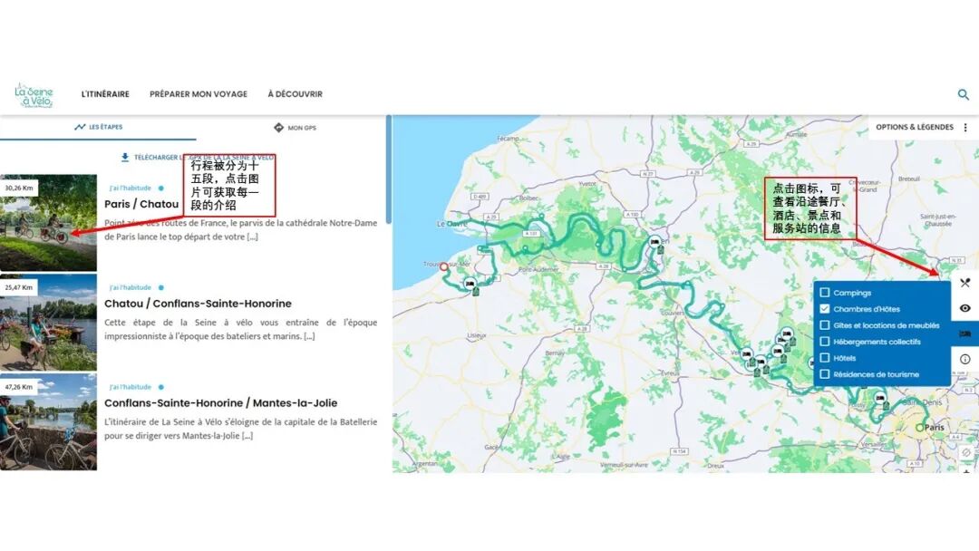 网站的“L'ITINÉRAIRE (路线)”版块为大家介绍了绿道的十五个分段。每一段行程都有详尽的路线描述、景点介绍和安全提示。沿途的餐厅、旅馆和服务站等信息也整齐地列在了右边,方便大家查看~