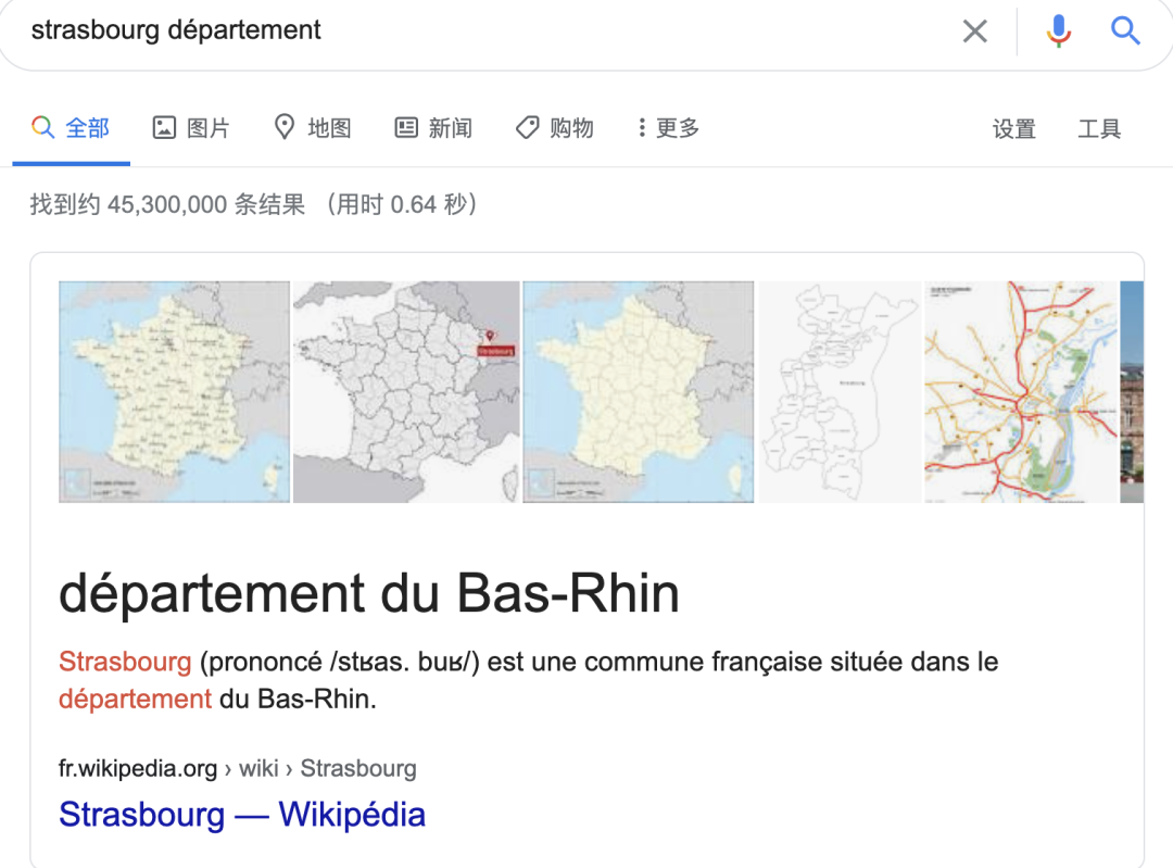 第二种,那就是直接把「城市法语名+département」输入谷歌,立即就会出现该城市所属的省份,比如用「斯特拉斯堡」来举例,就是这样的?