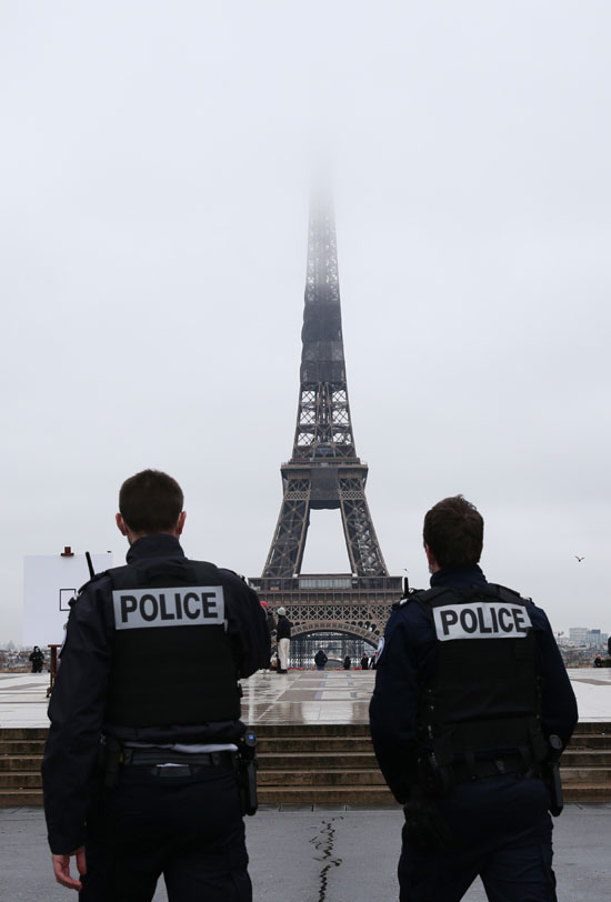 警察在法国巴黎埃菲尔铁塔附近的特罗卡德罗广场巡逻。