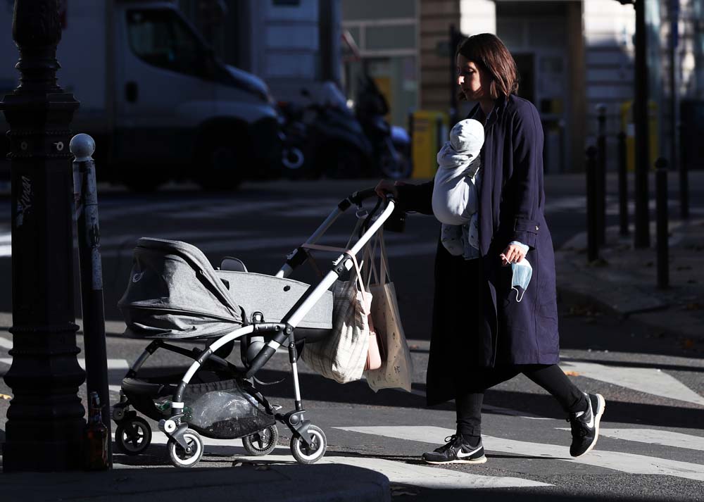 2020年11月9日,一名女子推婴儿车走在巴黎街头。(图片来源:新华社)