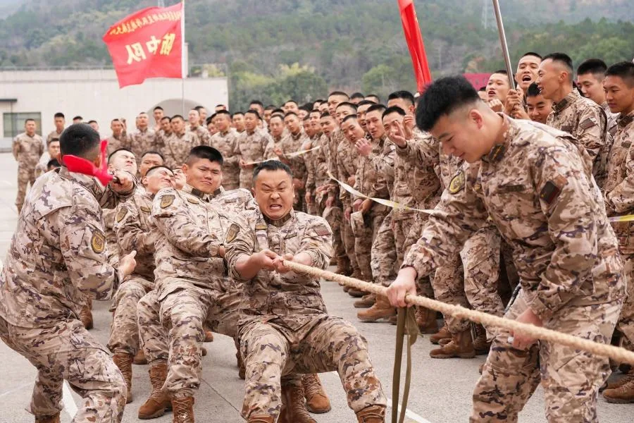 官兵们紧握长绳、脚蹬地面